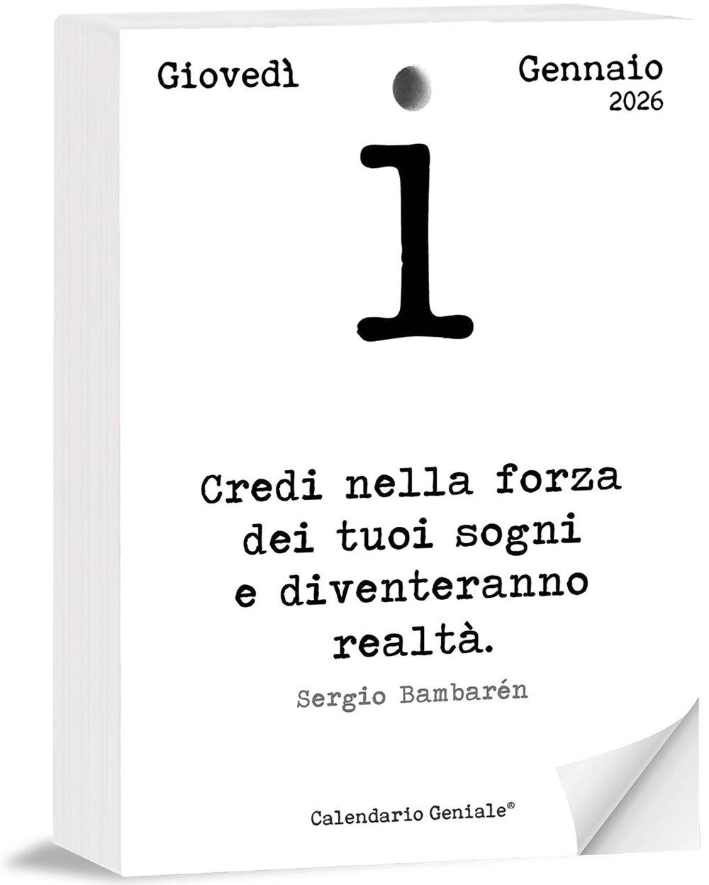 Calendario geniale® 2026. Leggi la frase del giorno e condividi il pensiero filosofico. Frasi filosofiche: arricchito di nuove frasi dei grandi autori per iniziare ogni giorno con la giusta motivazione. Calendario con scatola. Inserto compatibile: questo inserto nel formato 10x14x4 cm è compatibile con il supporto in legno 12x17x5 cm delle edizioni precedenti. Prodotto artigianale: lavorato completamente a mano in Italia, realizzato con materiali biologici, stampato su carta ecologica con inchiostri vegetali.