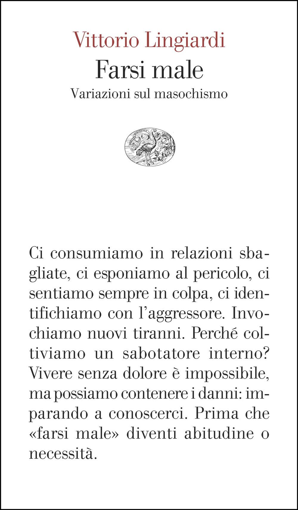 Succede a tutti di farsi male, ma possiamo imparare a riconoscere le sofferenze che ci colpiscono alle spalle da quelle a cui noi stessi, più o meno consapevolmente, ci consegniamo. Vittorio Lingiardi delimita un territorio vastissimo e oscuro: percorre la storia dei nostri dolori e traccia un confine tra convivenza e connivenza. Masochista è un aggettivo che turba, ma qui non si parla di fruste e manette: lo sguardo è sulla personalità e sulle relazioni. Lingiardi ci accompagna in stanze interiori, arredate con gli spigoli aguzzi dell’autocritica, le mensole inaccessibili dell’ideale dell’Io, le casseforti del sabotatore interno, le lavatrici interminabili del senso di colpa. Un racconto sulla vita di tutti i giorni, con un finale sul masochismo politico e il dolore del mondo. Pagine scritte con le parole della psicoanalisi, della poesia, del cinema.